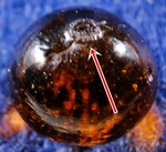 Pinpoint Pontil marbles are very rare. Occasionally, Melted Pontil Transitionals or Crease Pontil Transitionals are confused with Pinpoint Pontil Transitionals. The pontil on these marbles is characterized by a very tiny pontil that looks almost like the head of a pin. The pontil on these marbles was formed because the glass was a little too cool when it was sheared off and then dripped into the machine rollers. As a result, the cut-off spot did not completely melt into the marble because the marble cooled too quickly as it was forming. Occasionally, these very rare pontils are found on marbles that are made from two opaque colors of glass, rather than a transparent and opaque color.